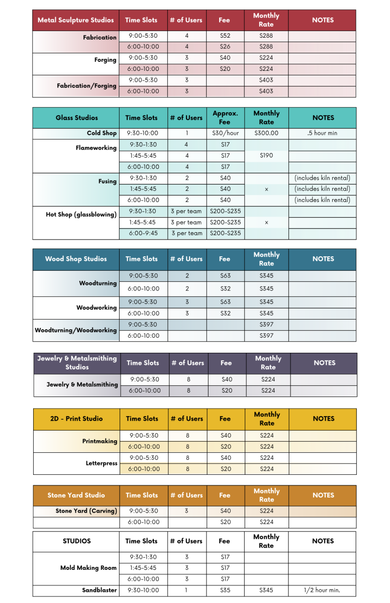 The Jewelry/Metalsmithing Studio offers classes in Jewelry/Metalsmithing, Casting, Enameling, Wire Wrapping, Stone Setting, Etching, Wax Carving, and other specialty topics, in addition to Master Artist Workshops and Public Events throughout the year. To learn more about the Jewelry/Metalsmithing Studio and its offerings, including studio access, click here.